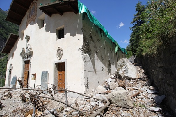 Alle 16:30 una frana di 7.500 metri cubi di roccia colpisce l’area del Santuario di Gallivaggio.